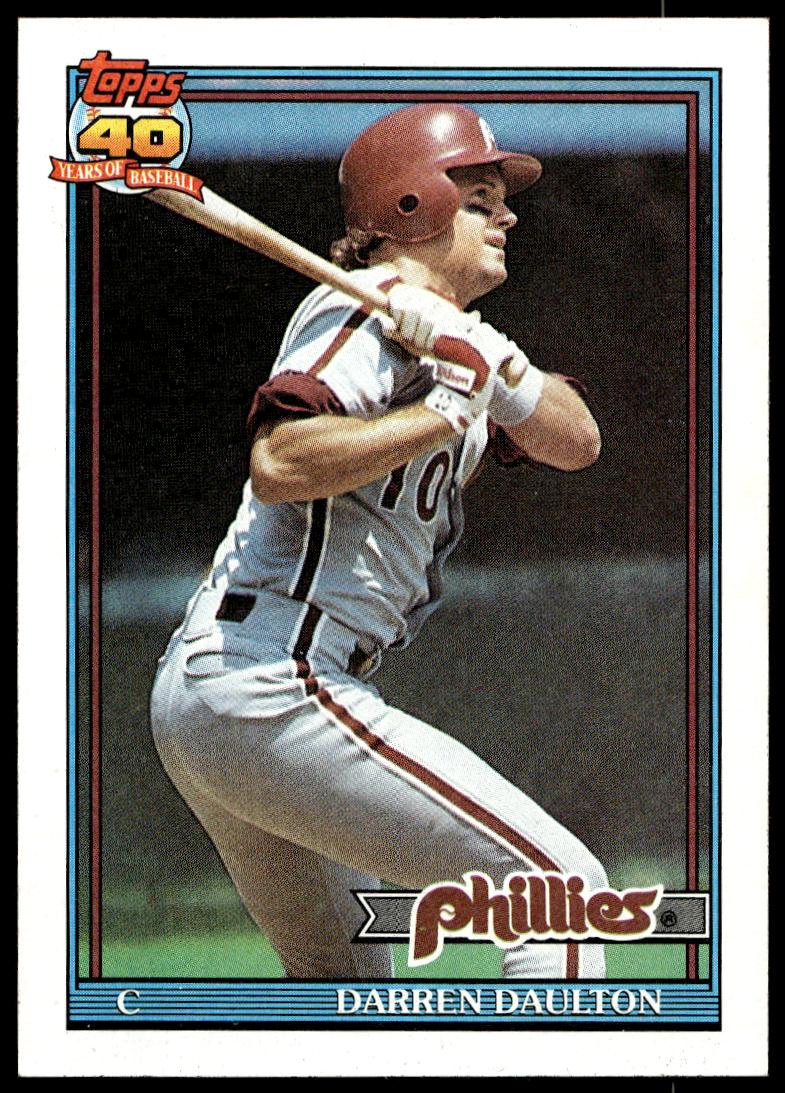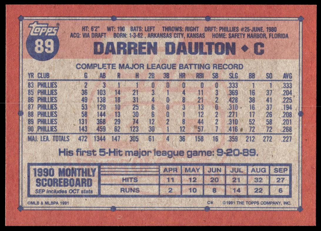 This Baseball card, from 1991 is part of the Topps  card set. Darren Daulton is featured and has a card number of 89.