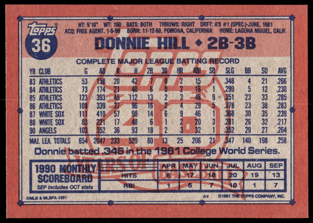 This Baseball card, from 1991 is part of the Topps  card set. Donnie Hill is featured and has a card number of 36.