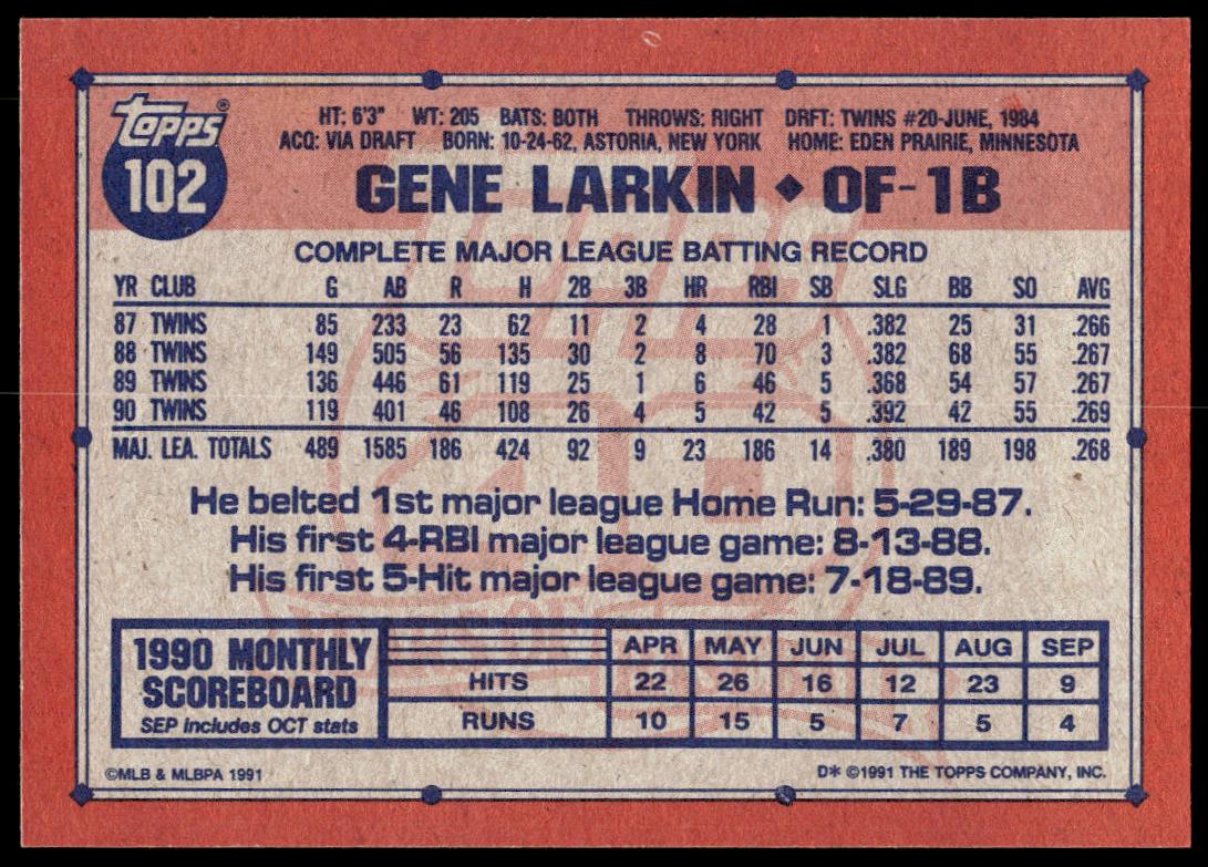 This Baseball card, from 1991 is part of the Topps  card set. Gene Larkin is featured and has a card number of 102.