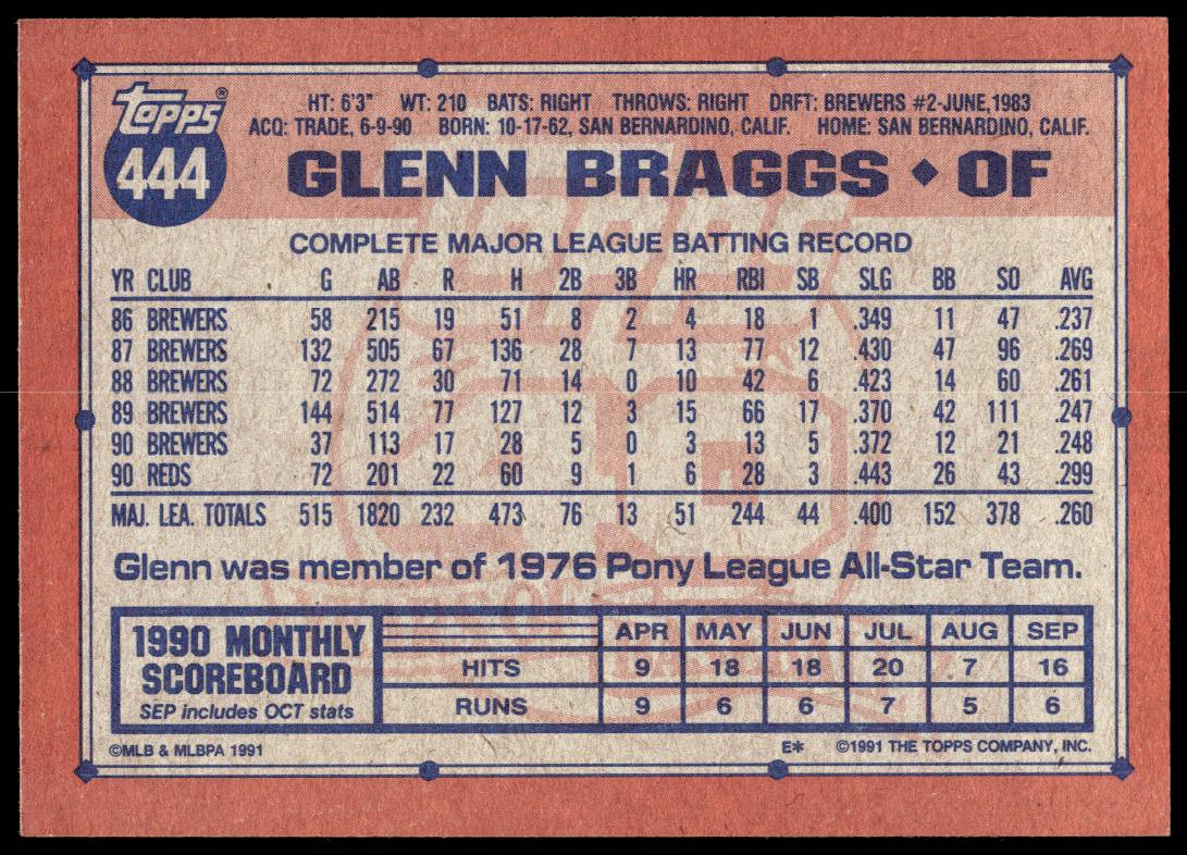 This Baseball card, from 1991 is part of the Topps  card set. Glenn Braggs is featured and has a card number of 444.