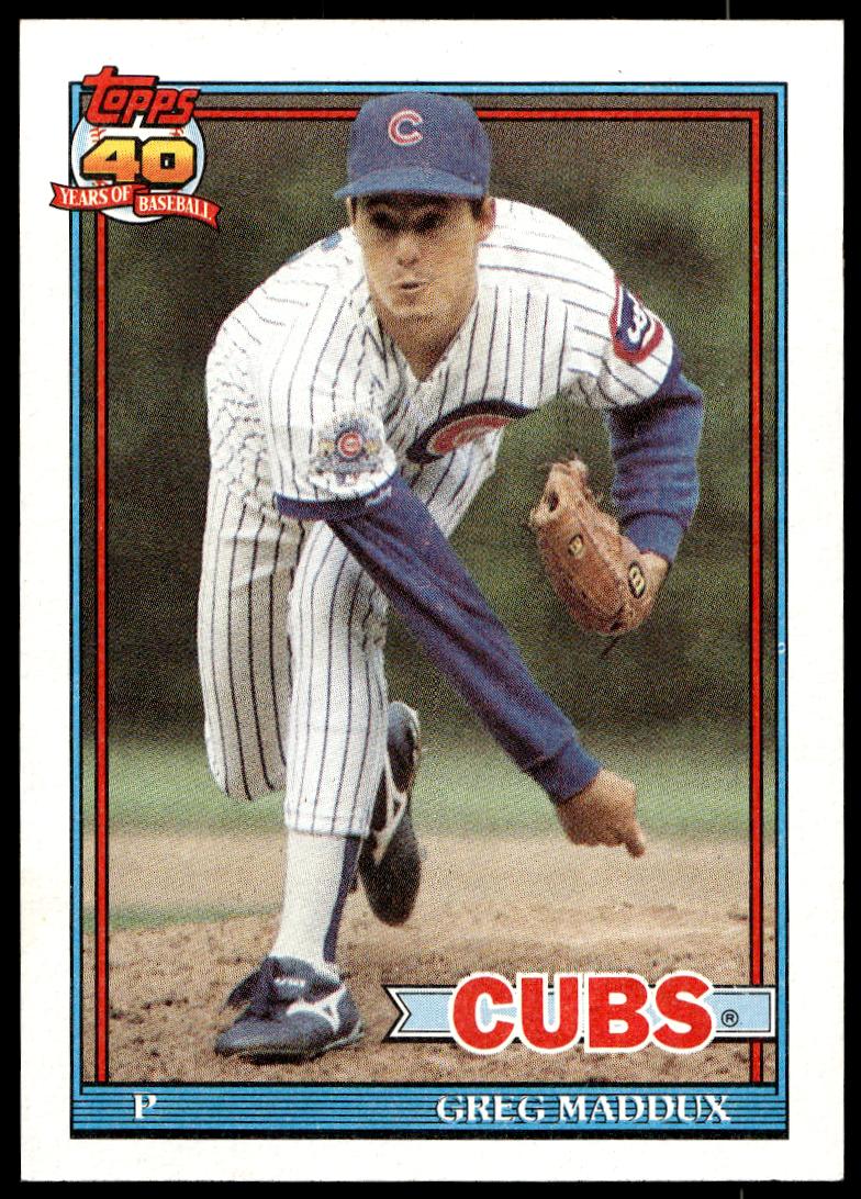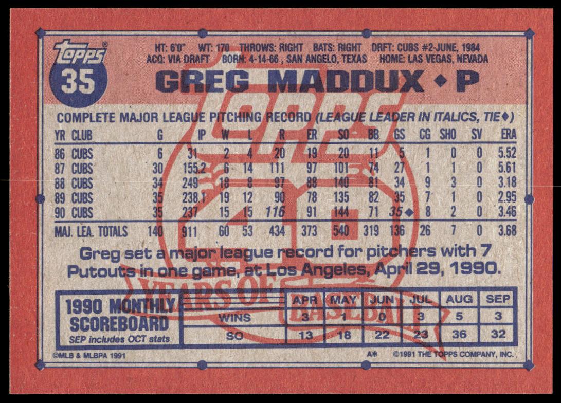 This Baseball card, from 1991 is part of the Topps  card set. Greg Maddux is featured and has a card number of 35.