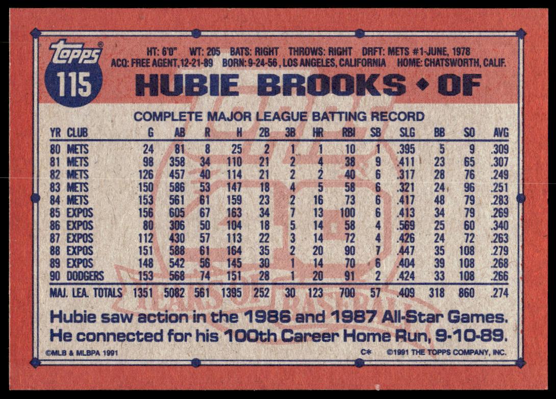 This Baseball card, from 1991 is part of the Topps  card set. Hubie Brooks is featured and has a card number of 115.