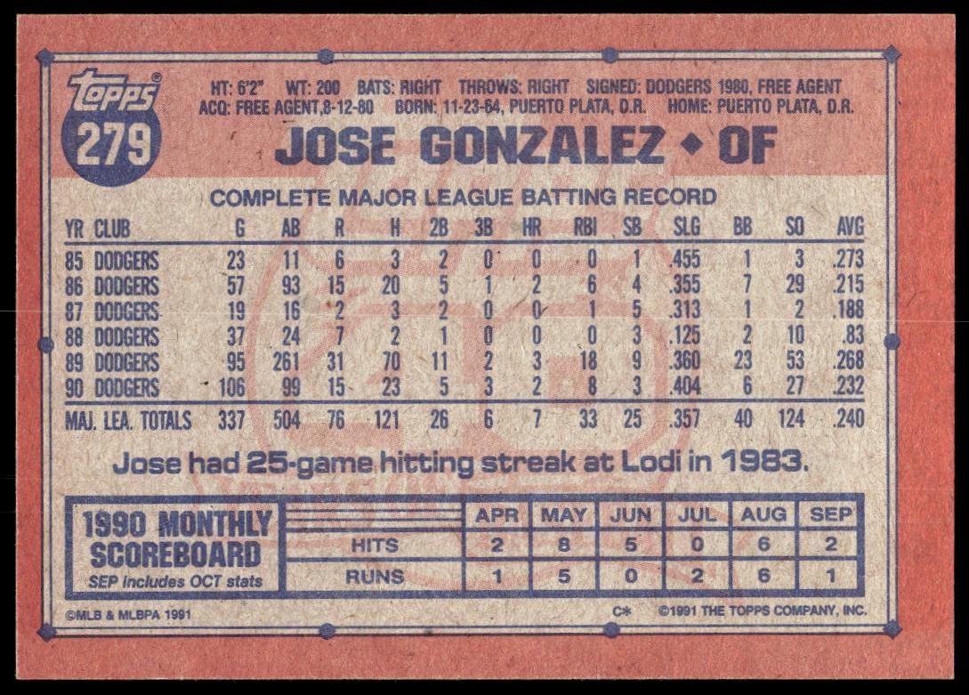 This Baseball card, from 1991 is part of the Topps  card set. Jose Gonzalez is featured and has a card number of 279.