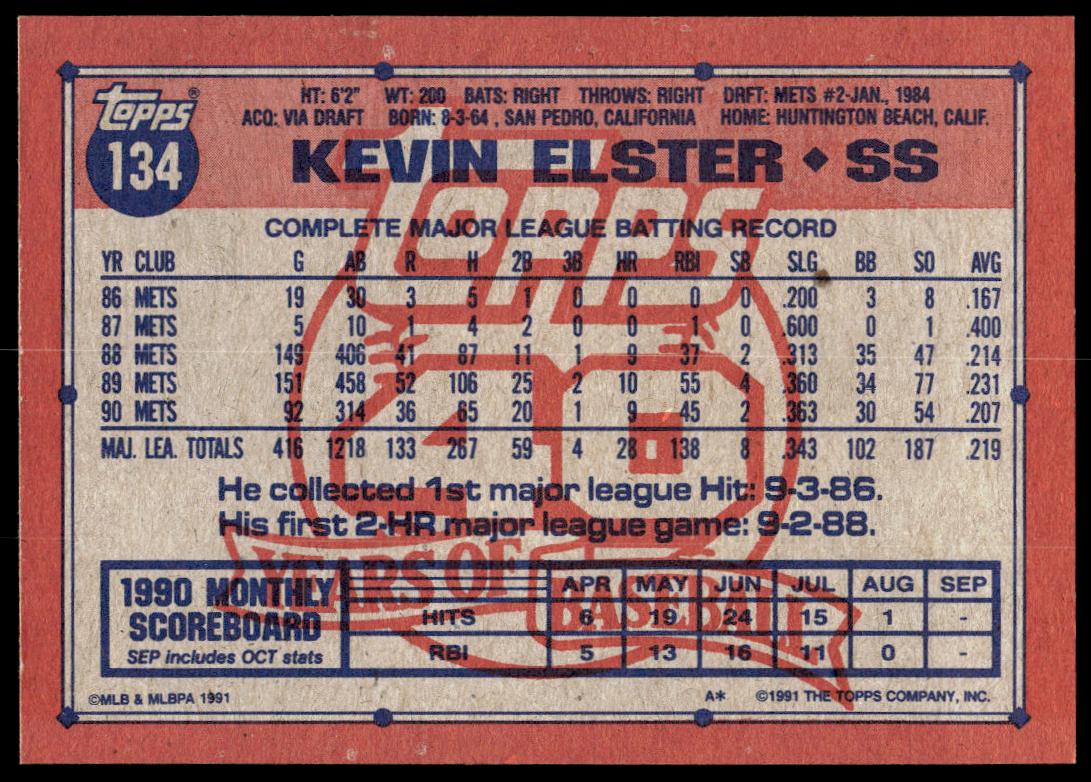 This Baseball card, from 1991 is part of the Topps  card set. Kevin Elster is featured and has a card number of 134.