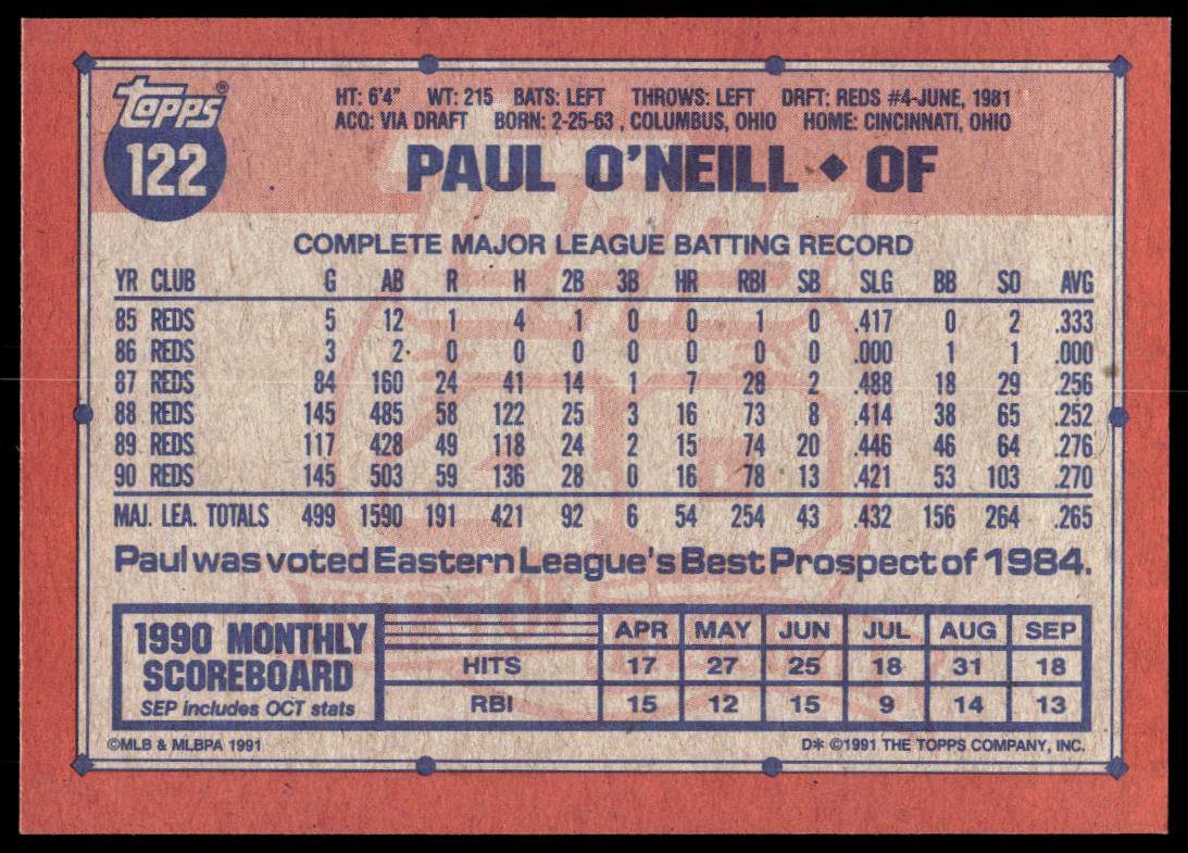 This Baseball card, from 1991 is part of the Topps  card set. Paul O’Neill is featured and has a card number of 122.