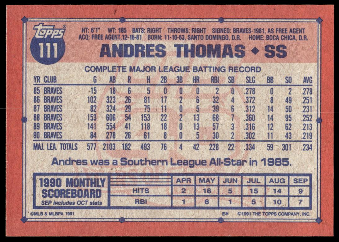 This Baseball card, from 1991 is part of the Topps  card set. Andres Thomas is featured and has a card number of 111.