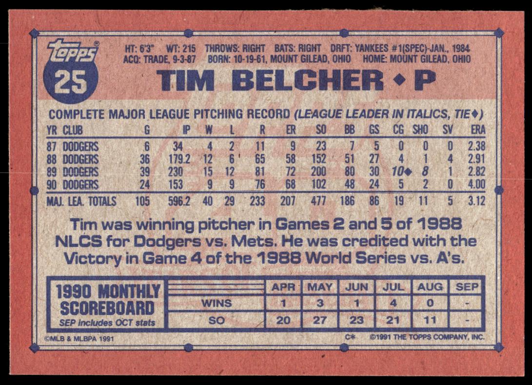 This Baseball card, from 1991 is part of the Topps  card set. Tim Belcher is featured and has a card number of 25.