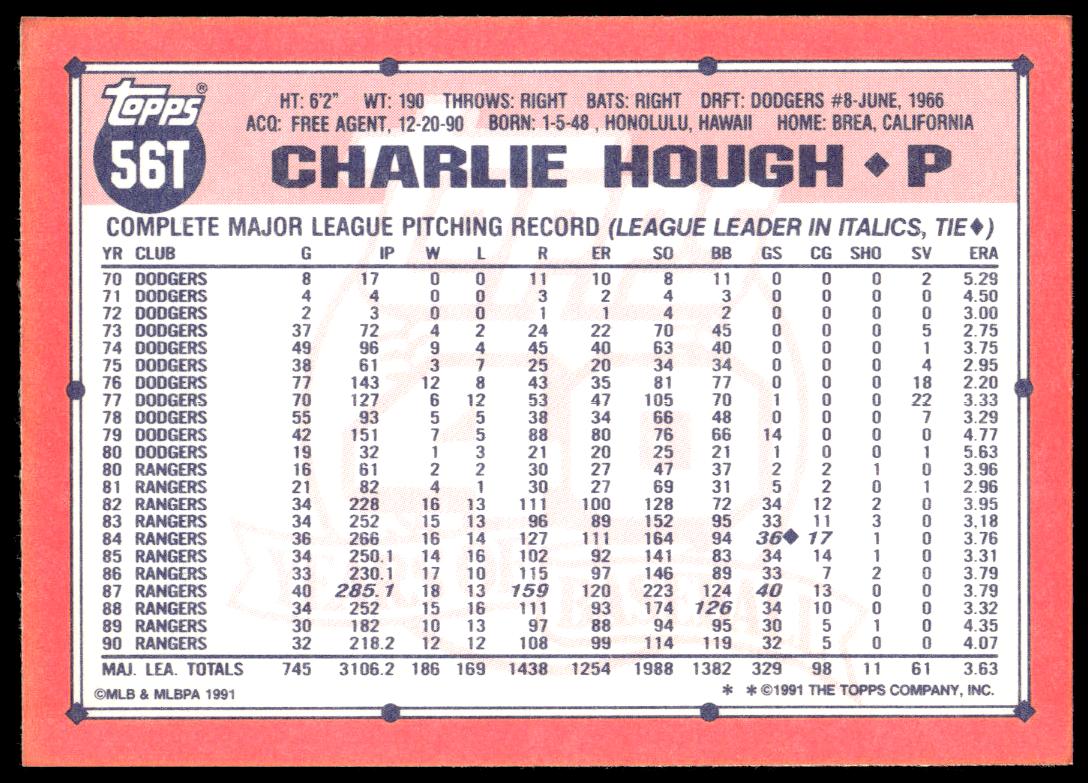 This Baseball card, from 1991 is part of the Topps Traded card set. Charlie Hough is featured and has a card number of 56T.