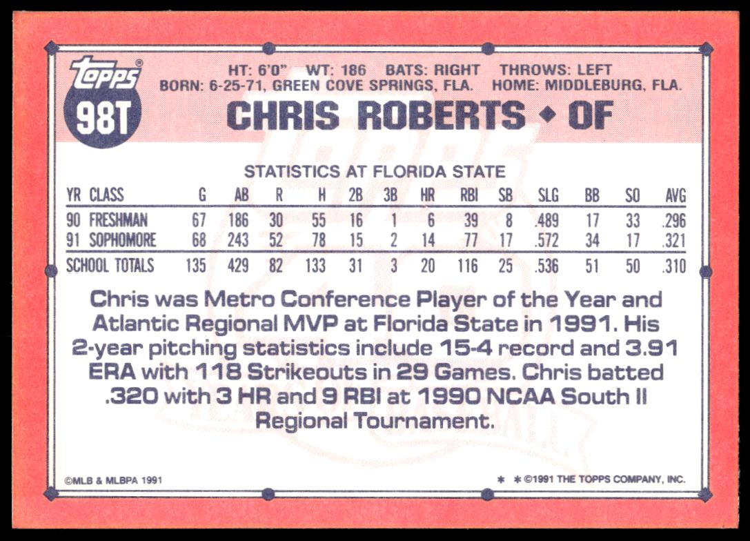 This Baseball card, from 1991 is part of the Topps Traded card set. Chris Roberts is featured and has a card number of 98T.