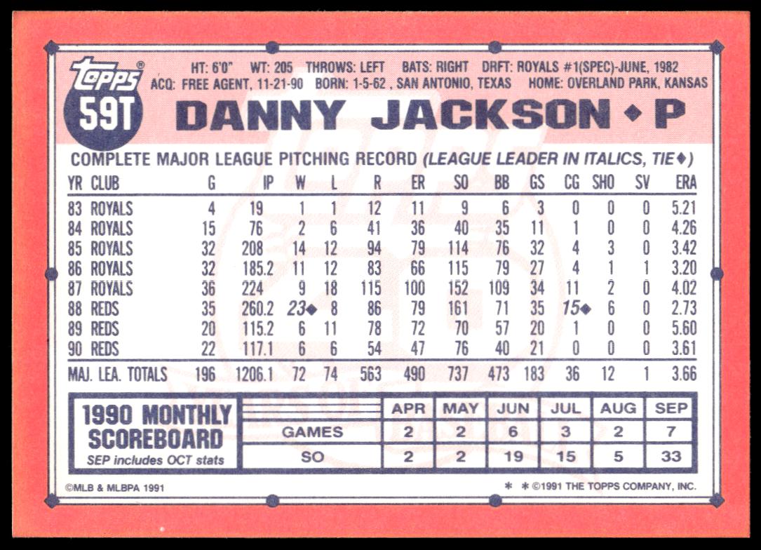 This BaseballΒ card, from 1991 is part of the Topps TradedΒ card set. Danny Jackson is featured and has a card number of 59T.