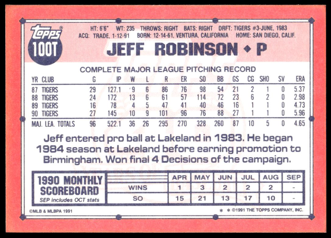 This BaseballΒ card, from 1991 is part of the Topps TradedΒ card set. Jeff Robinson is featured and has a card number of 100T.