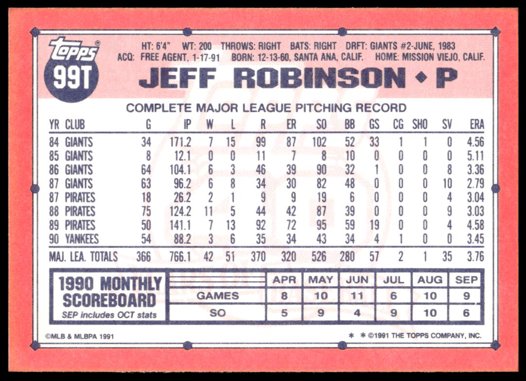 This BaseballΒ card, from 1991 is part of the Topps TradedΒ card set. Jeff Robinson is featured and has a card number of 99T.