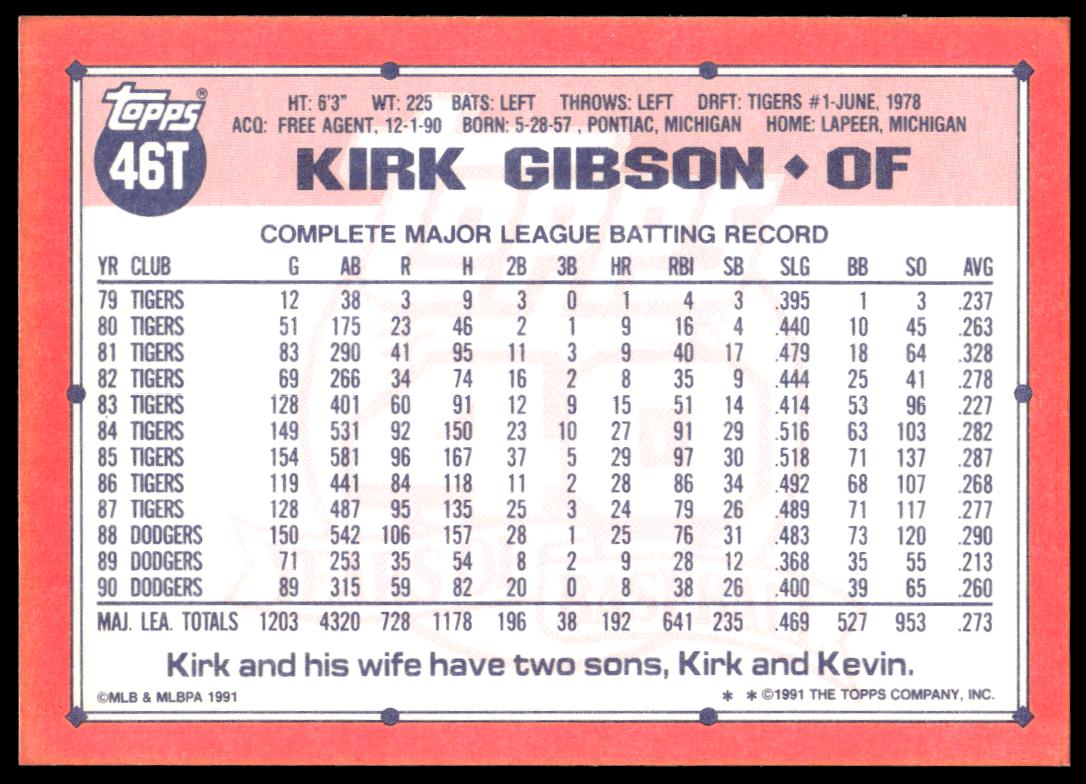 This BaseballΒ card, from 1991 is part of the Topps TradedΒ card set. Kirk Gibson is featured and has a card number of 46T.