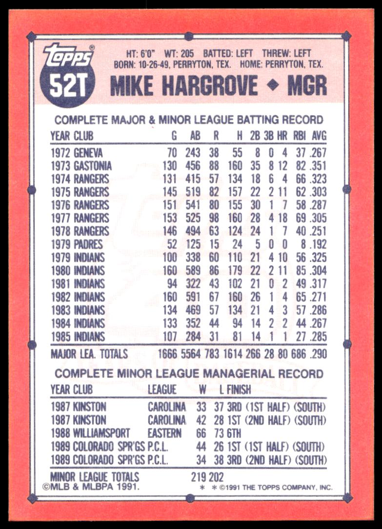 This BaseballΒ card, from 1991 is part of the Topps TradedΒ card set. Mike Hargrove is featured and has a card number of 52T.