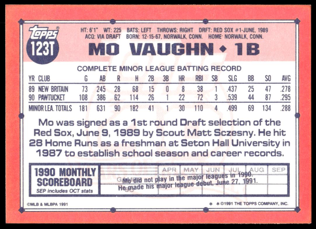 This Baseball card, from 1991 is part of the Topps Traded card set. Mo Vaughn is featured and has a card number of 123T.