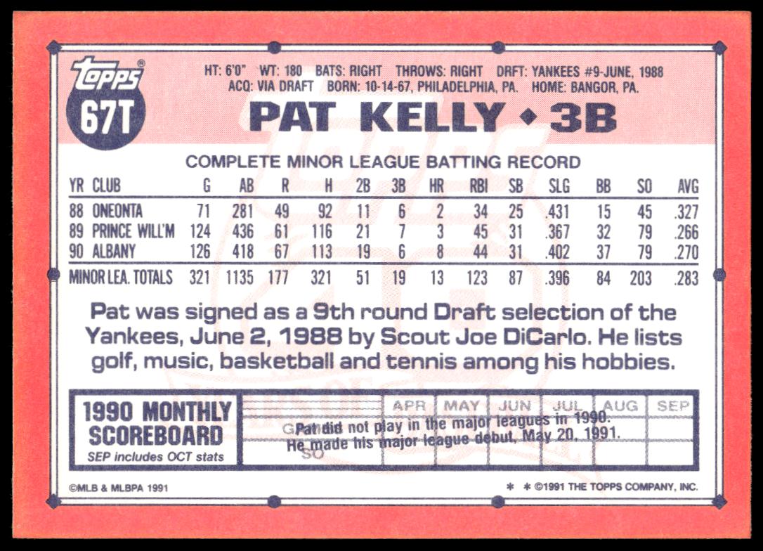 This Baseball card, from 1991 is part of the Topps Traded card set. Pat Kelly is featured and has a card number of 67T.