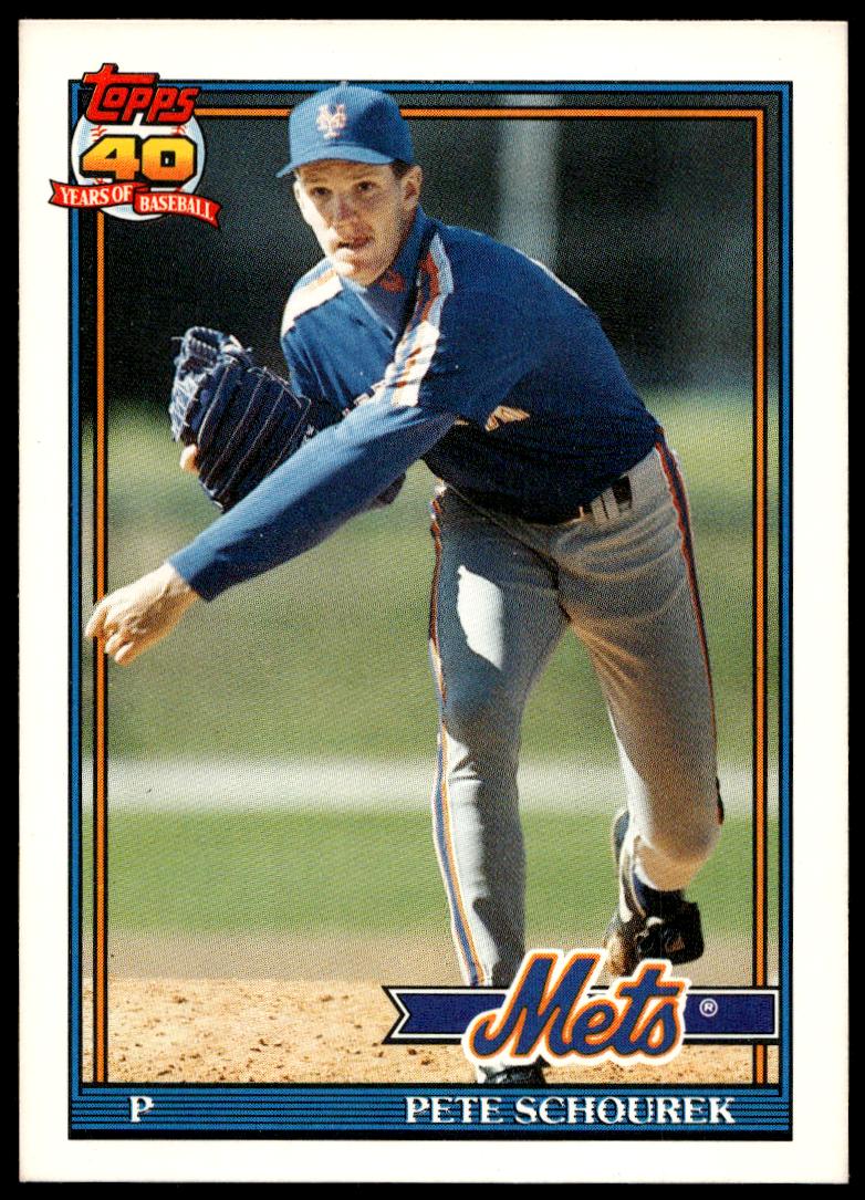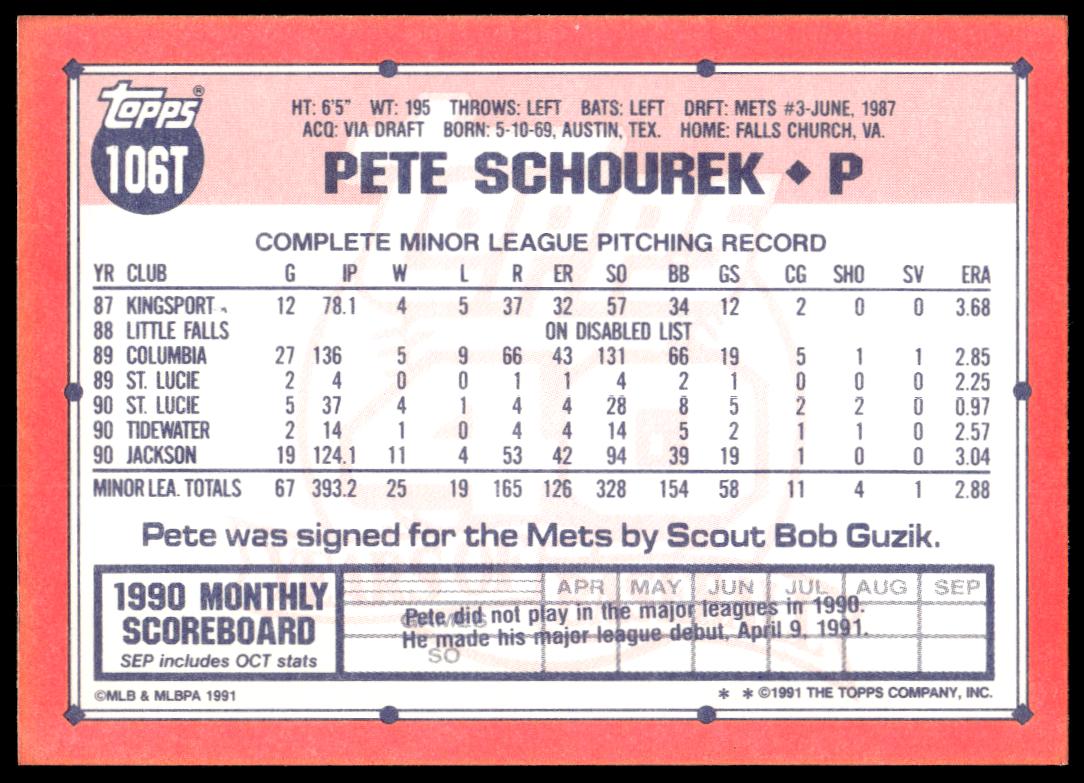 This BaseballΒ card, from 1991 is part of the Topps TradedΒ card set. Pete Schourek is featured and has a card number of 106T.