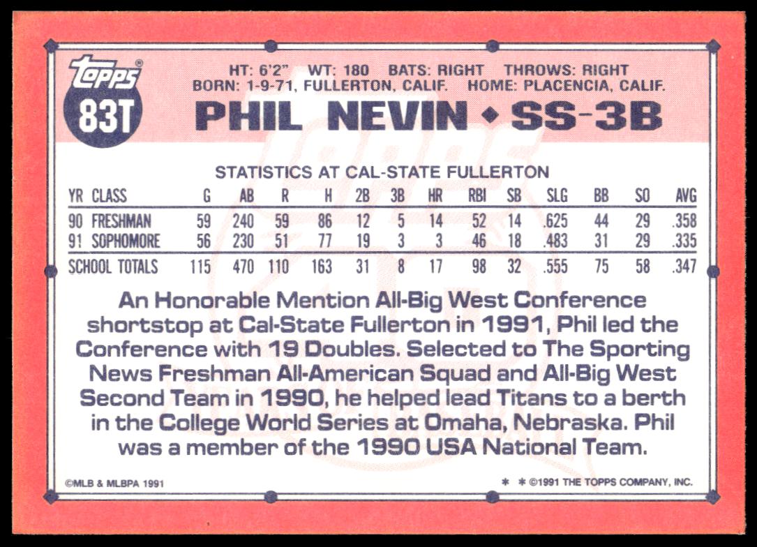 This Baseball card, from 1991 is part of the Topps Traded card set. Phil Nevin is featured and has a card number of 83T.