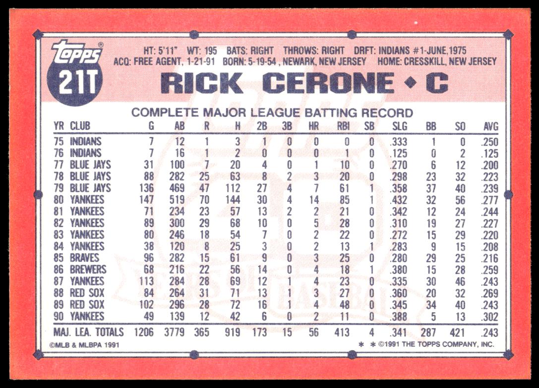 This BaseballΒ card, from 1991 is part of the Topps TradedΒ card set. Rick Cerone is featured and has a card number of 21T.