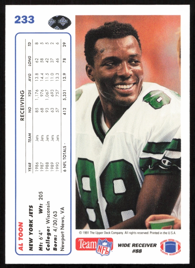 This Football card, from 1991 is part of the Upper Deck card set. Al Toon is featured and has a card number of 233.