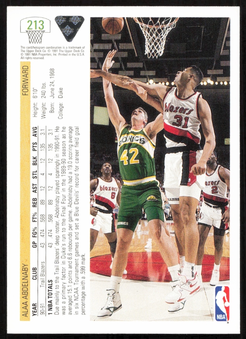 This Basketball card, from 1991-92 is part of the Upper Deck card set. Alaa Abdelnaby is featured and has a card number of 213.