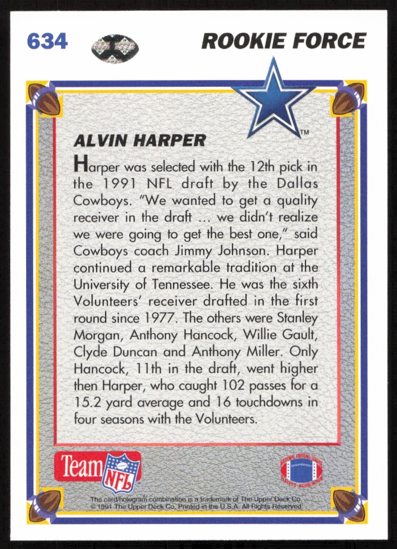 This Football card, from 1991 is part of the Upper Deck card set. Alvin Harper is featured and has a card number of 634.