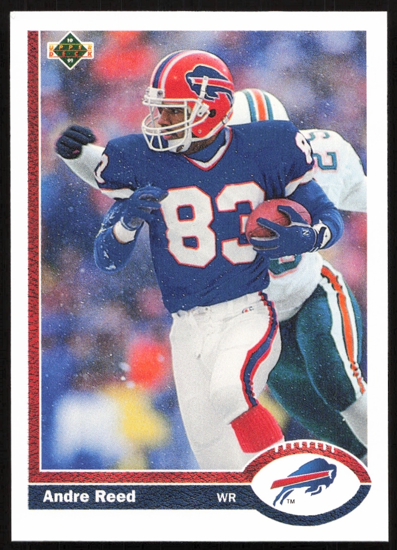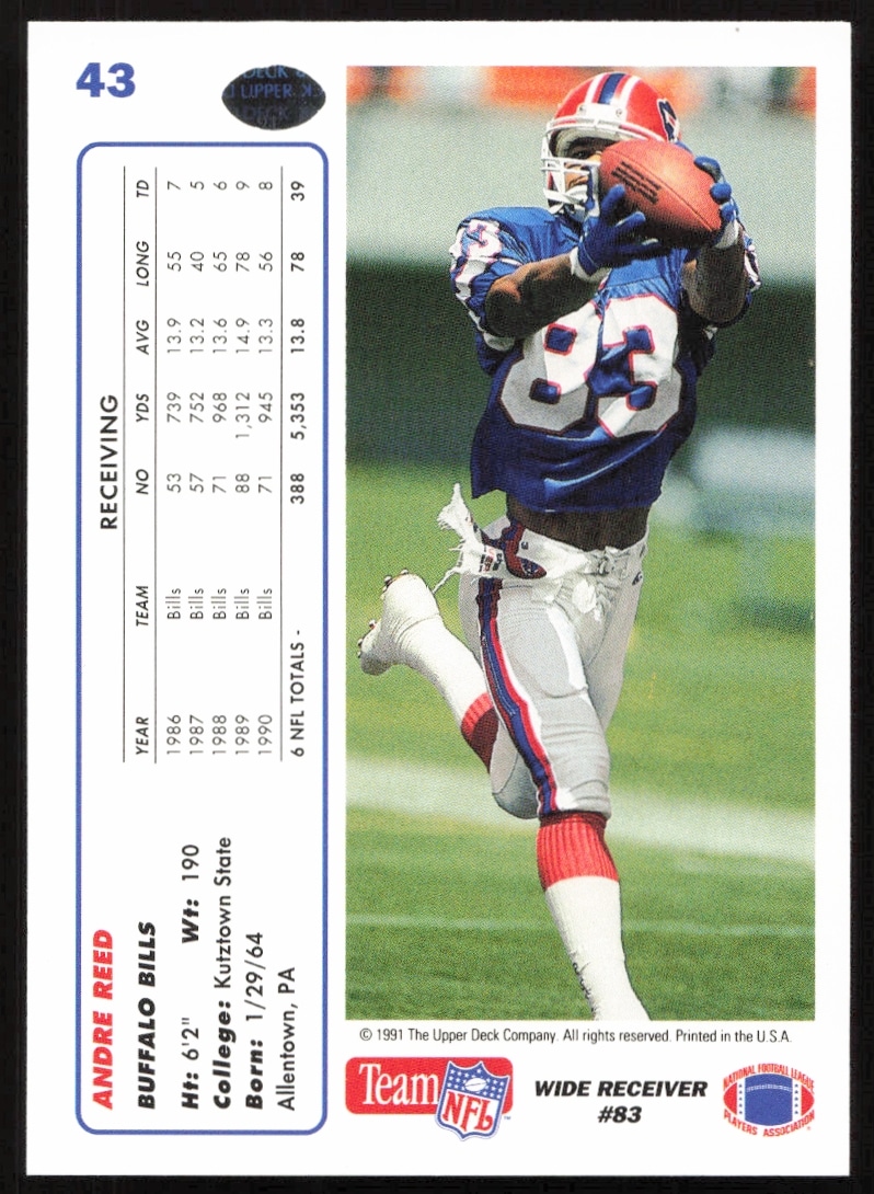 This Football card, from 1991 is part of the Upper Deck card set. Andre Reed is featured and has a card number of 43.