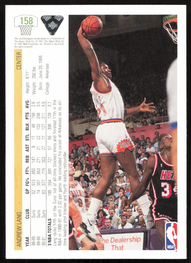 This Basketball card, from 1991-92 is part of the Upper Deck card set. Andrew Lang is featured and has a card number of 158.