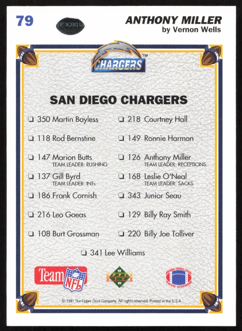 This Football card, from 1991 is part of the Upper Deck card set. Anthony Miller is featured and has a card number of 79.