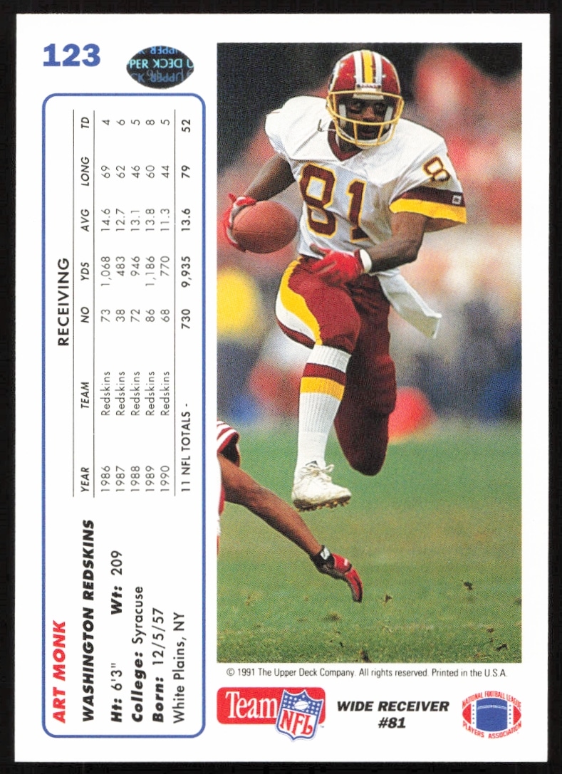 This Football card, from 1991 is part of the Upper Deck card set. Art Monk is featured and has a card number of 123.