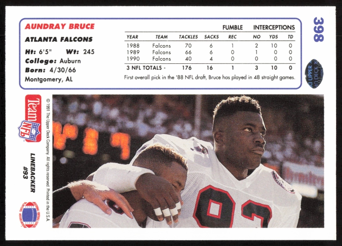 This Football card, from 1991 is part of the Upper Deck card set. Aundray Bruce is featured and has a card number of 398.
