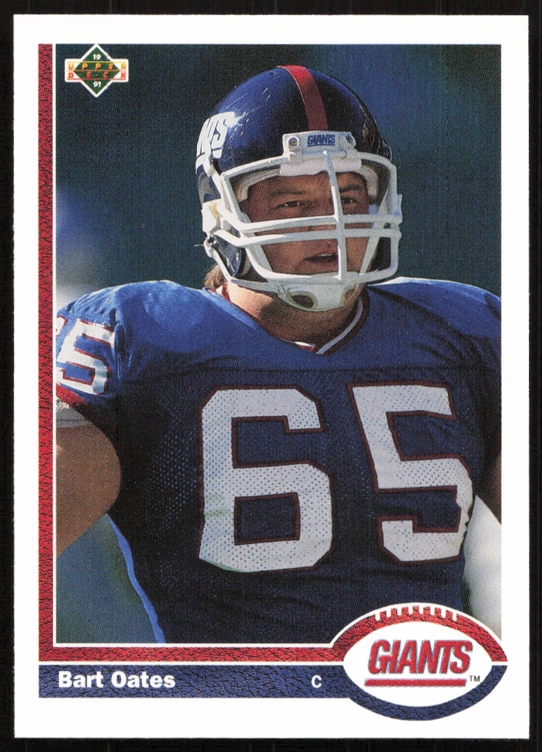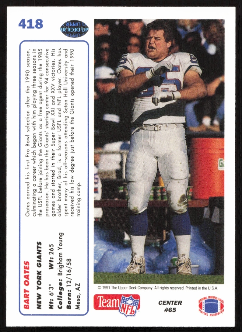 This Football card, from 1991 is part of the Upper Deck card set. Bart Oates is featured and has a card number of 418.