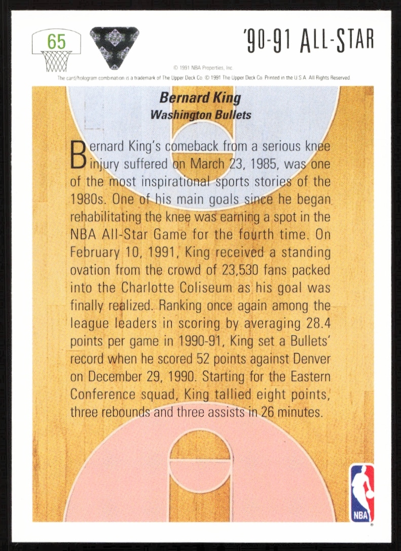 This Basketball card, from 1991-92 is part of the Upper Deck card set. Bernard King is featured and has a card number of 65.