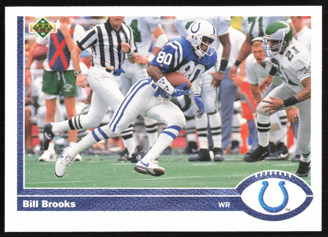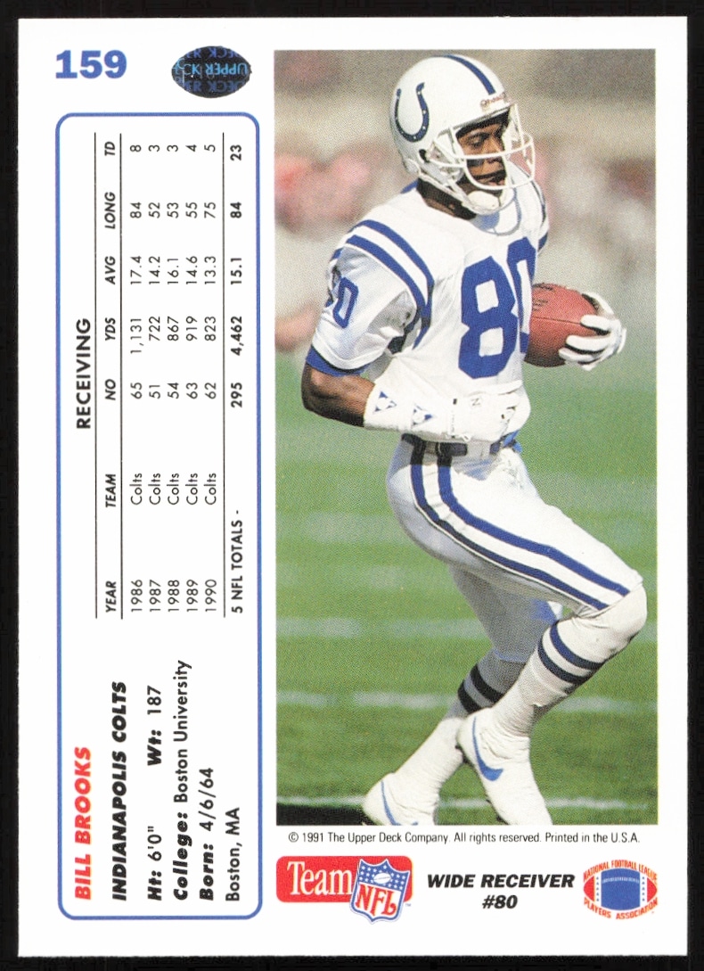 This Football card, from 1991 is part of the Upper Deck card set. Bill Brooks is featured and has a card number of 159.