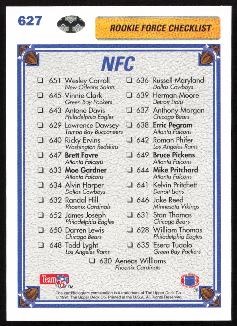 1991 Upper Deck Brett Favre / Mike Pritchard / Erric Pegram / Moe Gardner / Bruce Pickens RF, CL #627