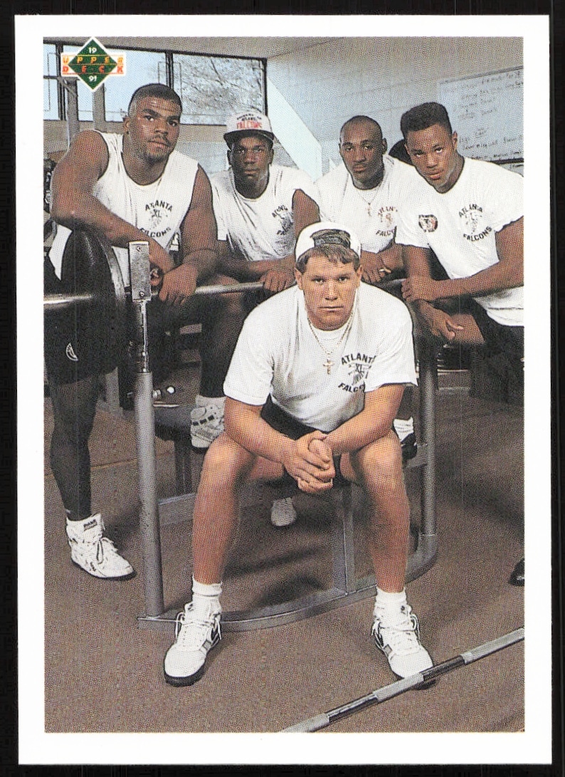 This Football card, from 1991 is part of the Upper Deck card set. Brett Favre / Mike Pritchard / Erric Pegram / Moe Gardner / Bruce Pickens RF, CL is featured and has a card number of 627.