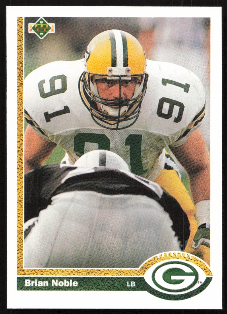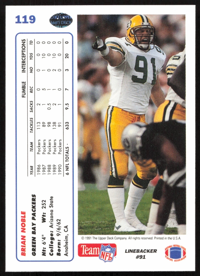This Football card, from 1991 is part of the Upper Deck card set. Brian Noble is featured and has a card number of 119.