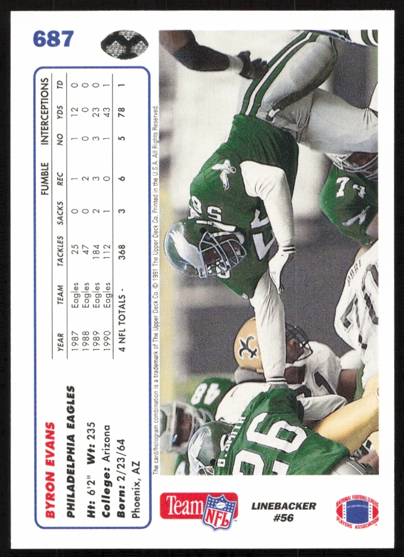 This Football card, from 1991 is part of the Upper Deck card set. Byron Evans is featured and has a card number of 687.