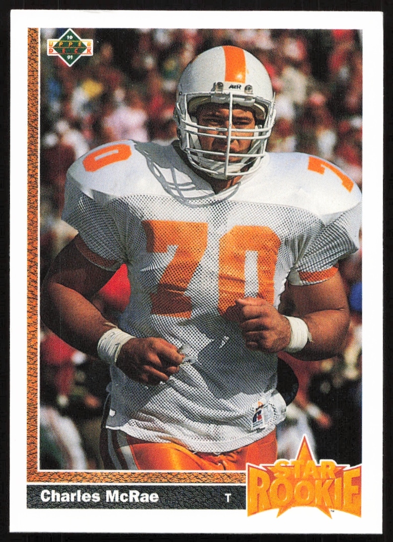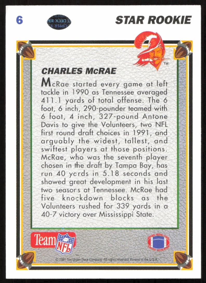 This Football card, from 1991 is part of the Upper Deck card set. Charles McRae is featured and has a card number of 6.