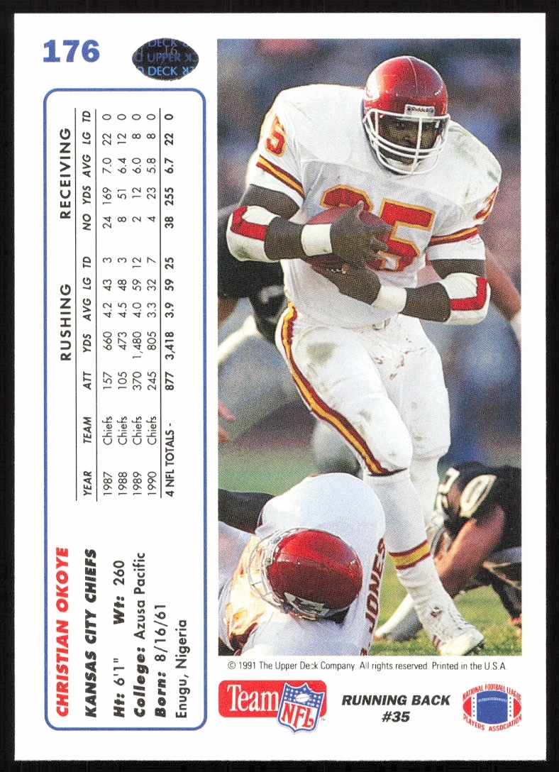 This Football card, from 1991 is part of the Upper Deck card set. Christian Okoye is featured and has a card number of 176.