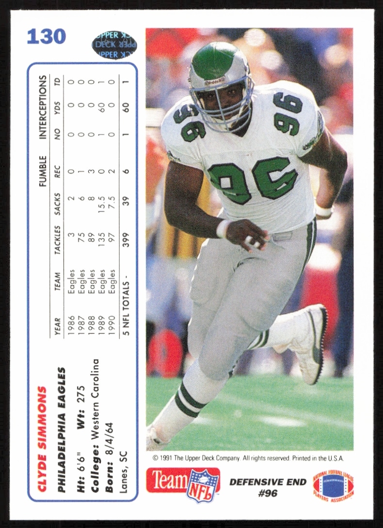 This Football card, from 1991 is part of the Upper Deck card set. Clyde Simmons is featured and has a card number of 130.
