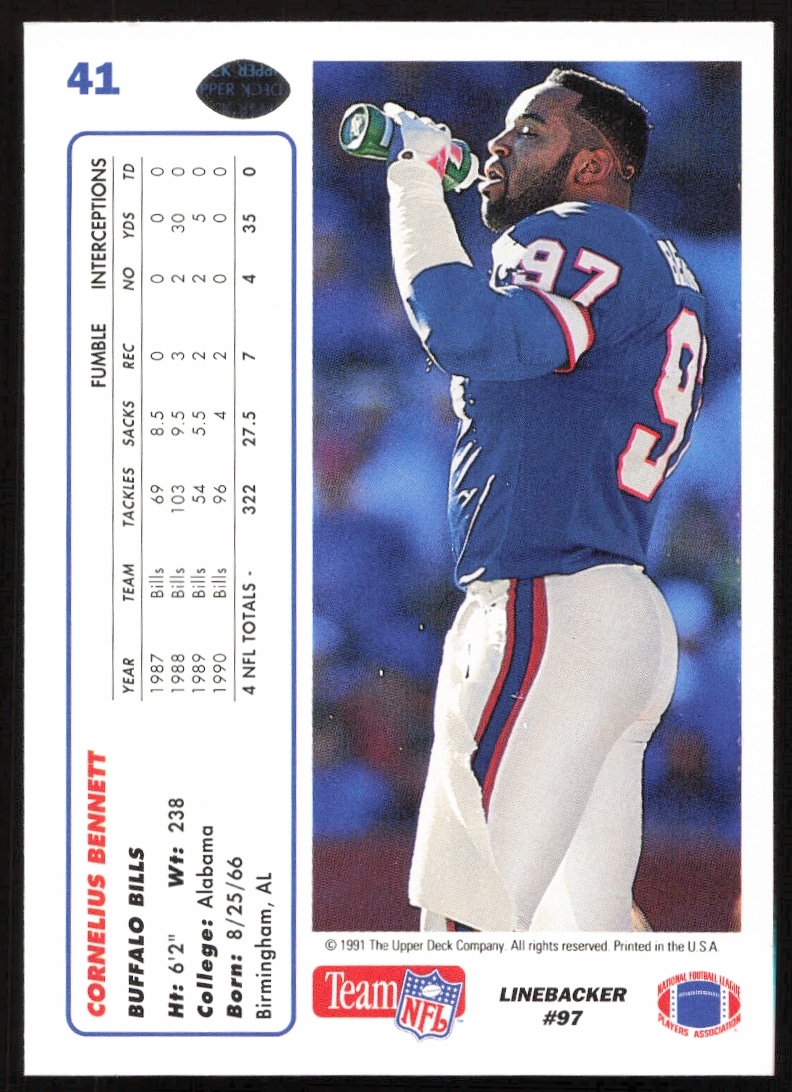 This Football card, from 1991 is part of the Upper Deck card set. Cornelius Bennett is featured and has a card number of 41.