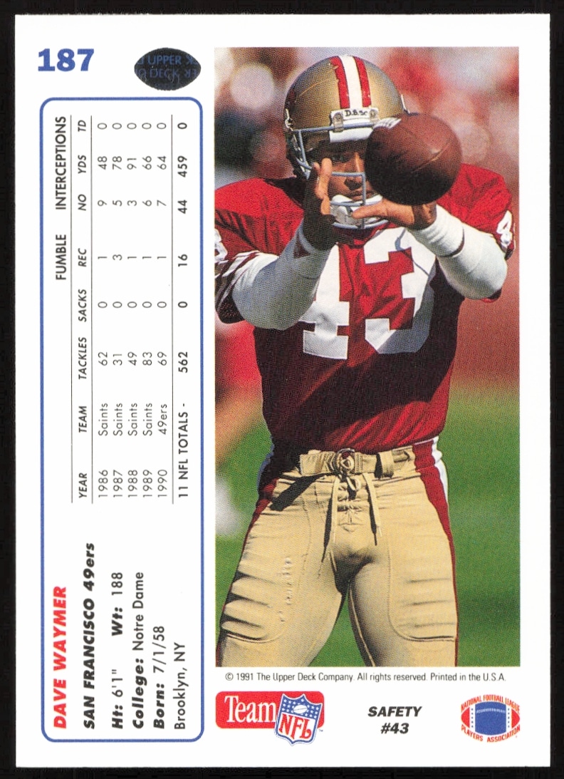 This Football card, from 1991 is part of the Upper Deck card set. Dave Waymer is featured and has a card number of 187.
