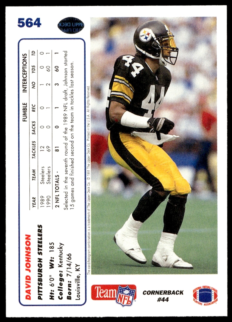 This Football card, from 1991 is part of the Upper Deck card set. David Johnson is featured and has a card number of 564.