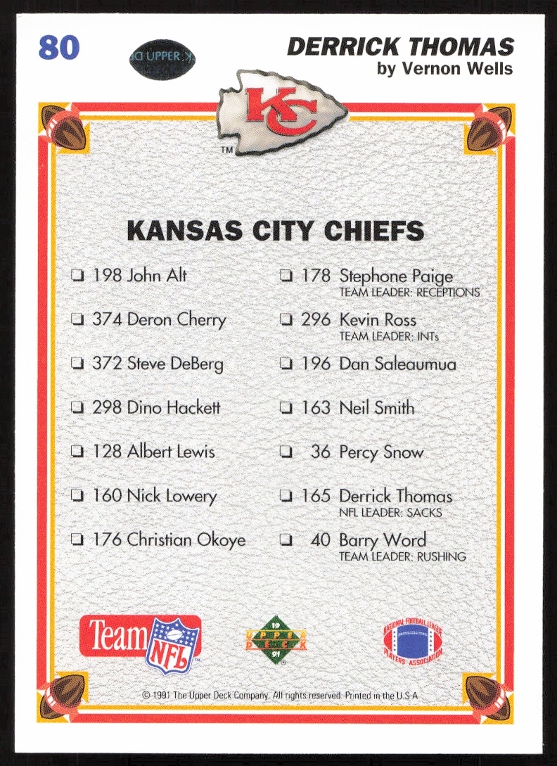 This Football card, from 1991 is part of the Upper Deck card set. Derrick Thomas is featured and has a card number of 80.