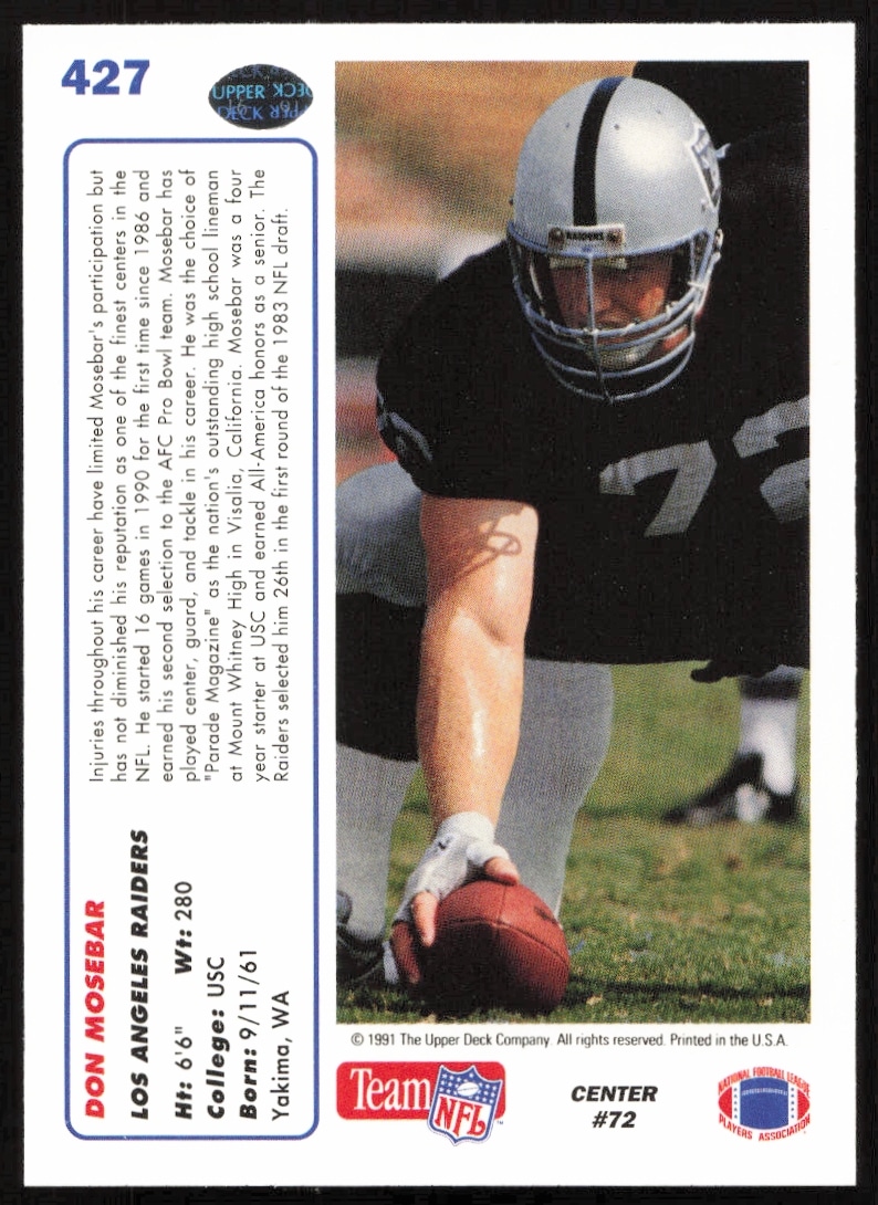 This Football card, from 1991 is part of the Upper Deck card set. Don Mosebar is featured and has a card number of 427.
