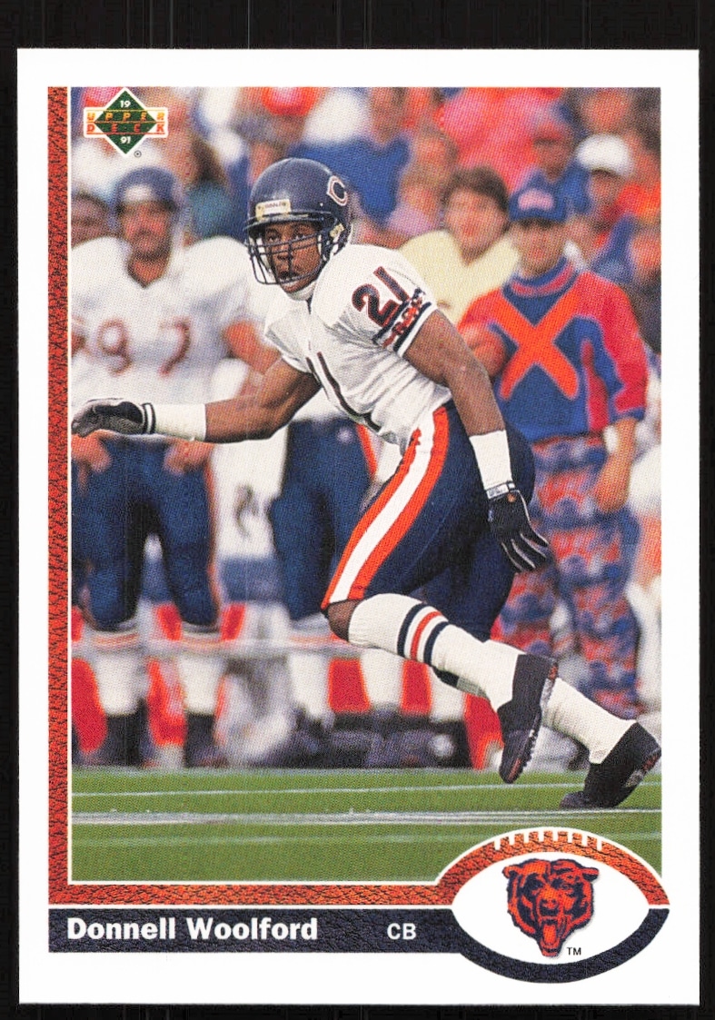 This Football card, from 1991 is part of the Upper Deck card set. Donnell Woolford is featured and has a card number of 505.