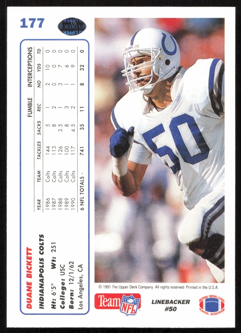 This Football card, from 1991 is part of the Upper Deck card set. Duane Bickett is featured and has a card number of 177.