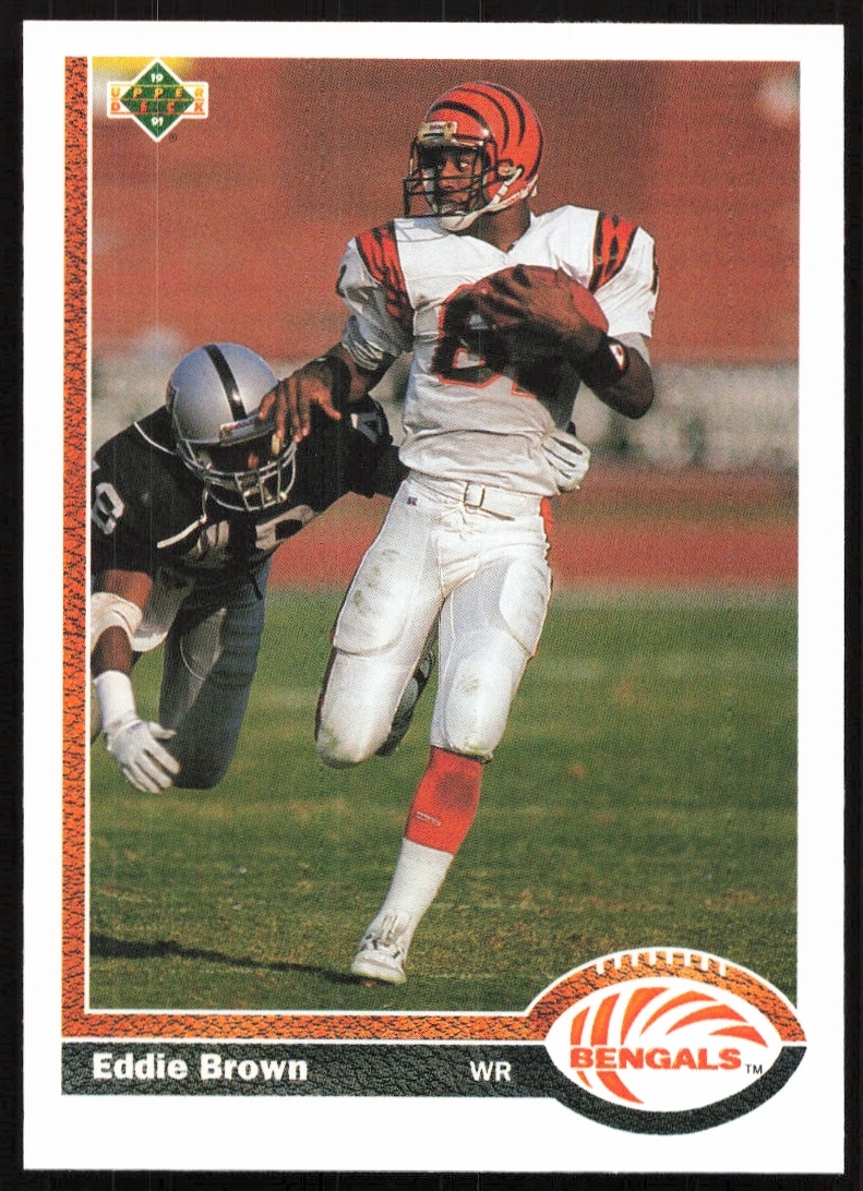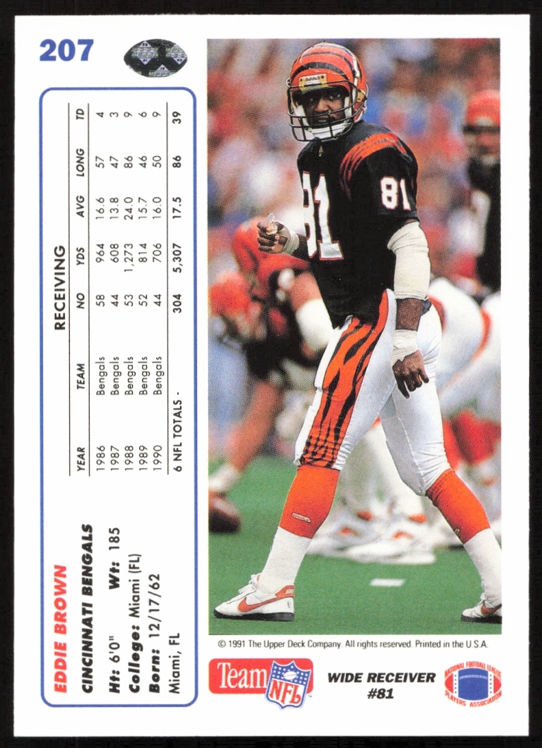 This Football card, from 1991 is part of the Upper Deck card set. Eddie Brown is featured and has a card number of 207.