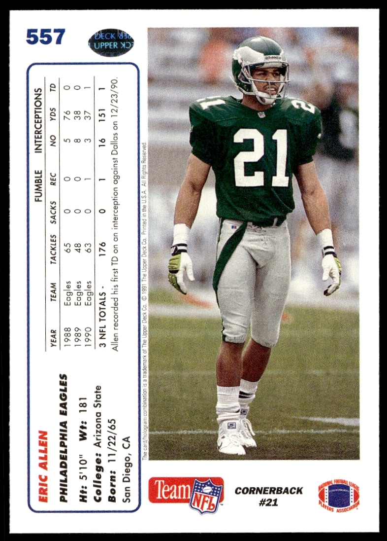 This Football card, from 1991 is part of the Upper Deck card set. Eric Allen is featured and has a card number of 557.